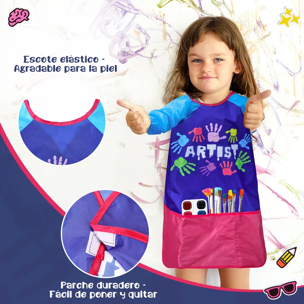 Tres bolsillos amplios: permiten guardar pinceles, pinturas, plastilina, toallas o utensilios pequeños.