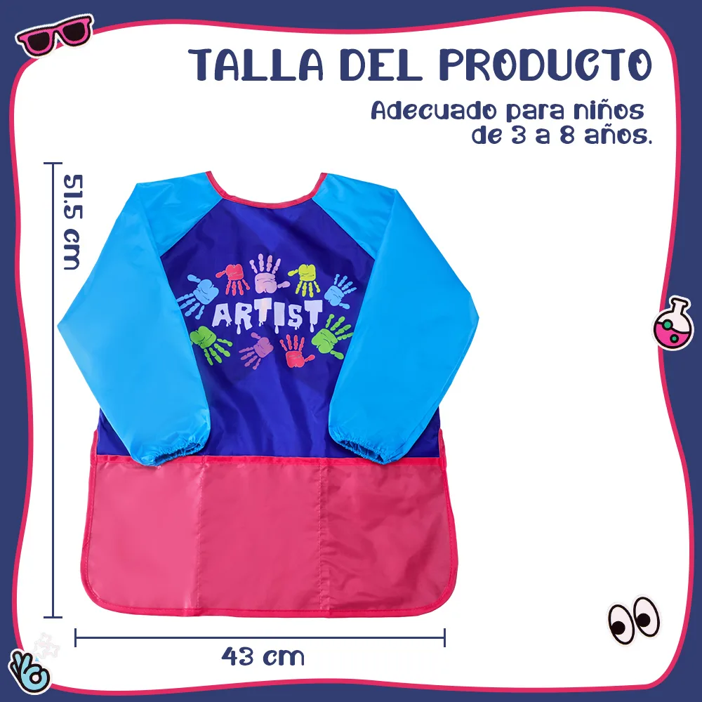 Este delantal está diseñado para proteger la ropa de los niños durante actividades de arte, manualidades, cocina y juegos. Su tamaño de 51,5 × 43 cm ofrece una cobertura completa, ideal para niños de 3 a 8 años.