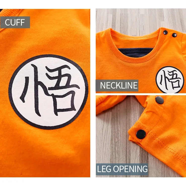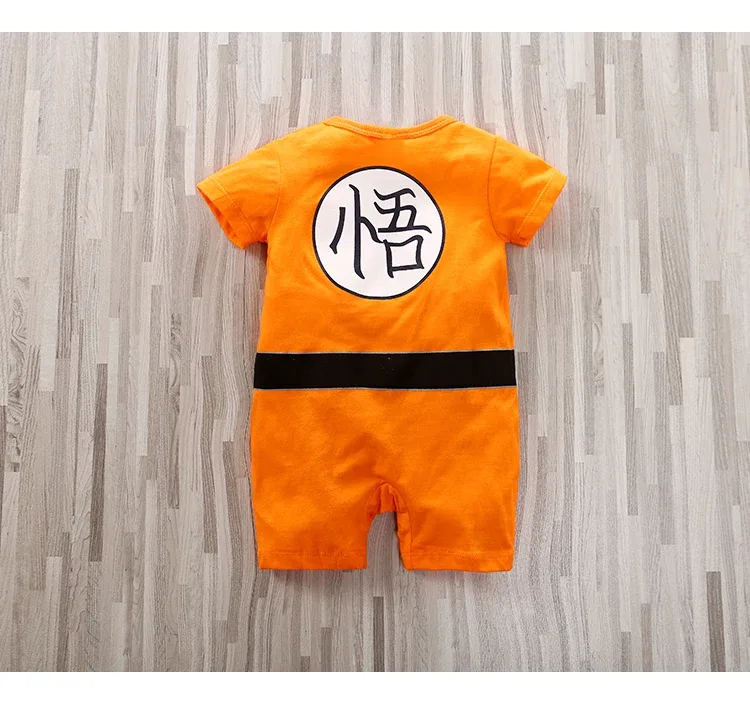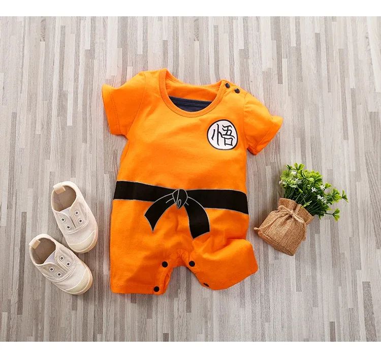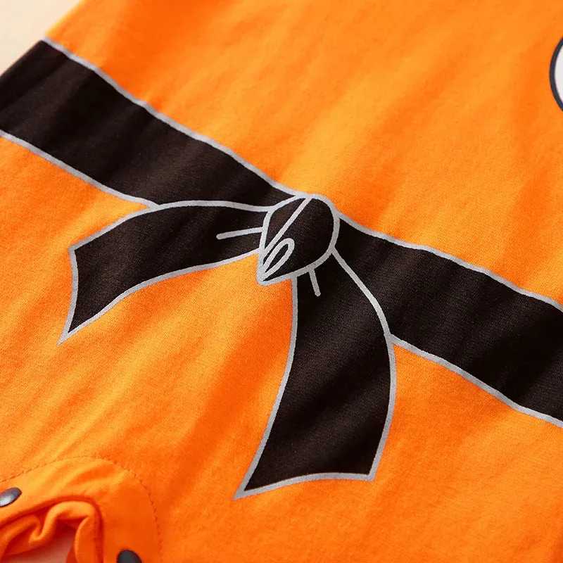 Enterito genérico para bebé en talla 6-9 meses, confeccionado en algodón suave y liviano, ideal para los días de verano. Su diseño naranja con detalles impresos recrea un estilo de artes marciales, ofreciendo una prenda divertida y cómoda para uso diario o para fotos temáticas.