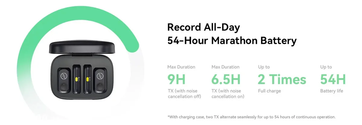 Uso prolongado gracias al estuche de carga. Ideal para jornadas largas de grabación.