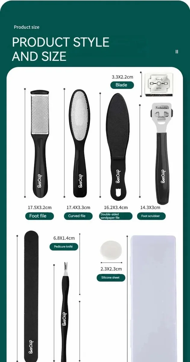 Este set de pedicura BeeChip está diseñado para brindar un cuidado completo de los pies desde la comodidad del hogar. Incluye 8 piezas especializadas que permiten exfoliar, raspar y suavizar la piel de manera segura.