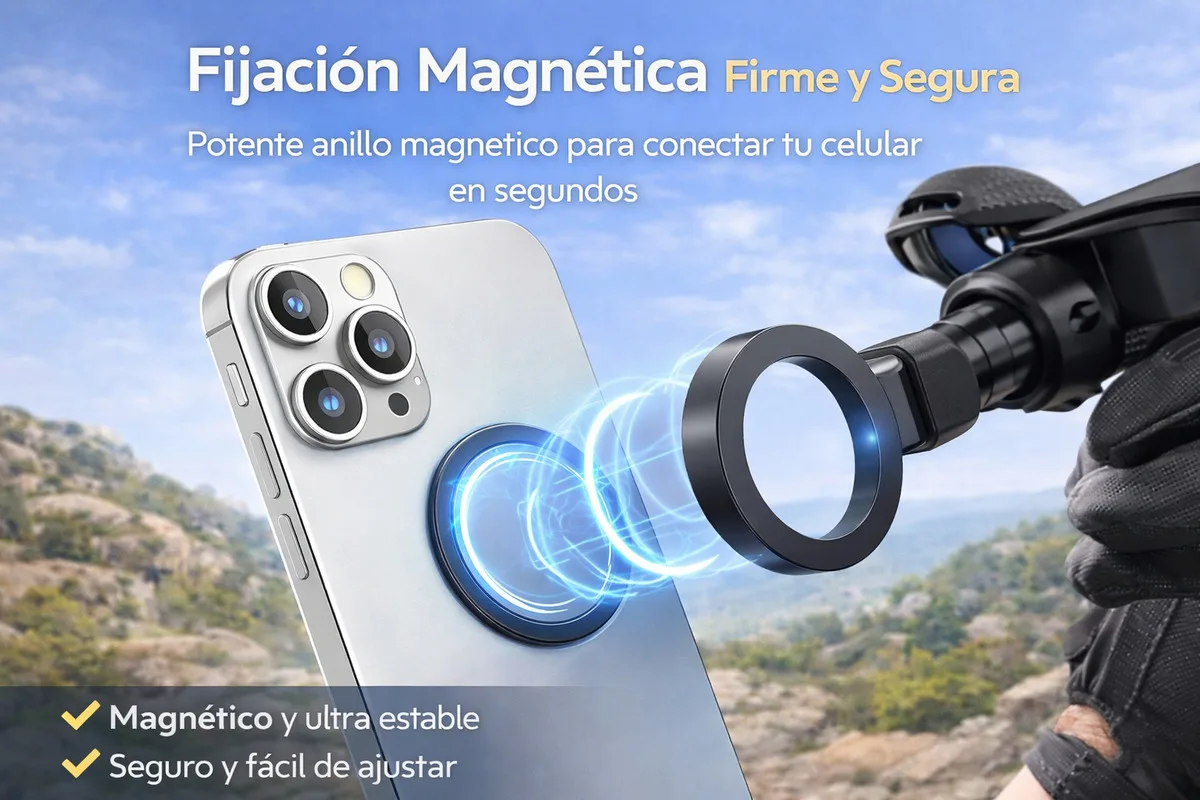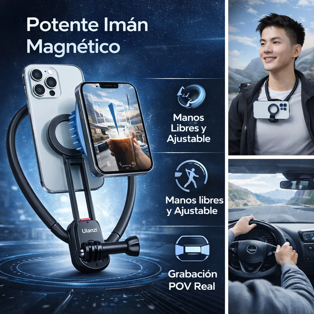 Su diseño ergonómico y magnético te permite grabar cómodo, estable y sin sostener el celular o la cámara, logrando tomas naturales y profesionales.