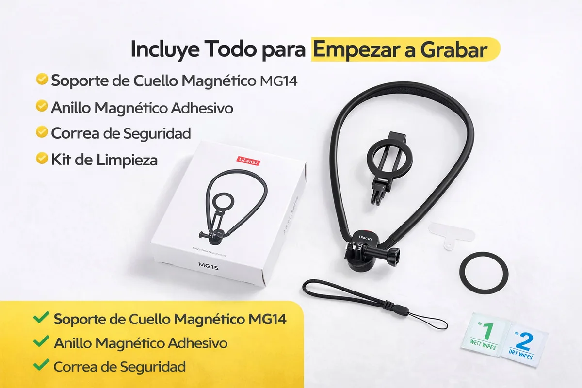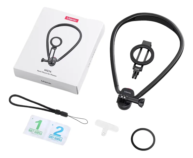 1 Soporte magnético de cuello Ulanzi MG14 1 Anillo magnético adhesivo para celular 1 Lanyard (correa de seguridad) 1 Lanyard tab 1 Kit de limpieza |