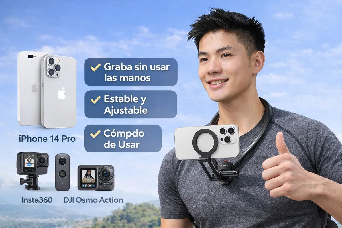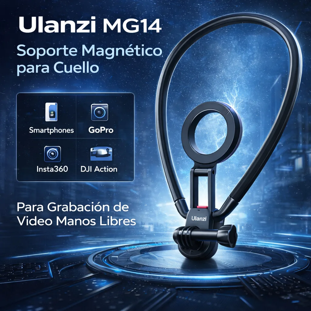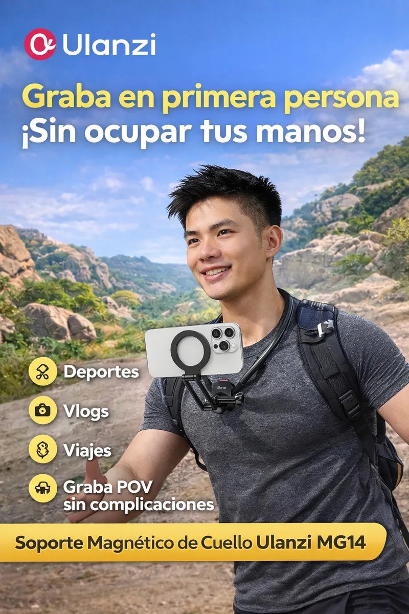 Captura exactamente lo que ves con el soporte magnético de cuello Ulanzi MG14, ideal para vlogs, viajes, deportes y grabaciones POV.