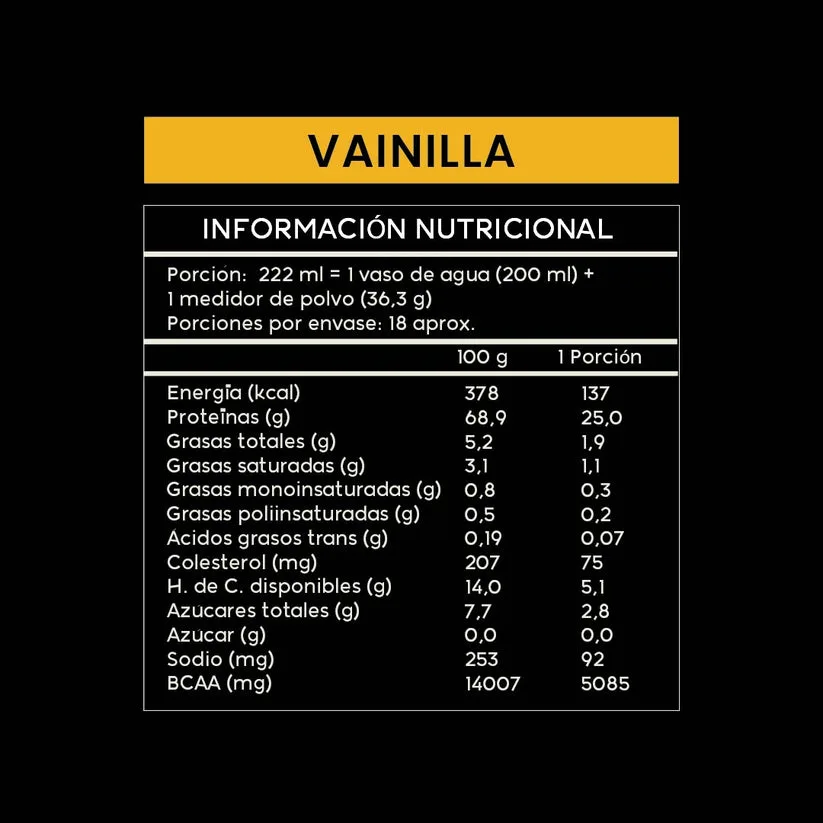 Disolver 1 scoop (aprox. 30 g) en 200-250 ml de agua o leche. Consumir después del entrenamiento o como refuerzo proteico diario.